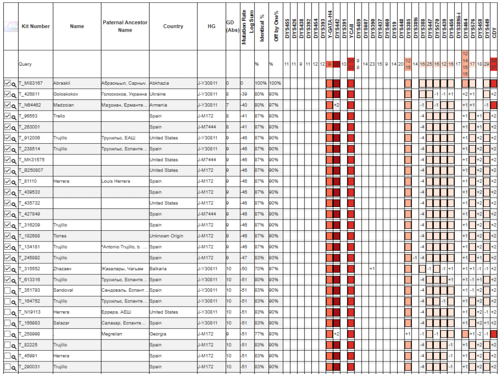 Потенциально к Абраскил близок украинец Голоскоков, а также испанский кластер внутри этого кавказского субклада (фамилии Трухильо, Эррера, Пенро, Торрес, Салазар, Сандоваль, де Переа и Мартинез). Из кавказских результатов ближе всего абхазы Агрба из села Мгудзырхуа, представители чеченского тейпа Салой, балкарцы Жазаевы и Жаразуевы.
