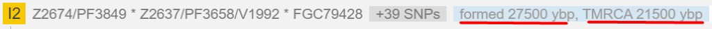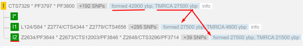 I это общая предковая линия I1 и I2, которые разошлись примерно 27,5 тыс. лет назад. Т.е. TMRCA I = formed последующих линий. На картинке виден контраст между I1 и I2. Обе эти линии разошлись 27,5 лет назад. Однако последний общий предок I2 жил около 21,5 тыс. лет назад, в то время как у I эта цифра всего 4600 лет!