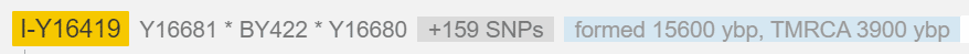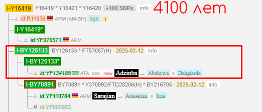 Последний общий предок всех Y16419 жил около 3900 лет назад. При этом разрыв с предшествующей линией более 10 тыс. лет! Точно предположить время когда эта ветка оказалась на Кавказе очень сложно. Произошло это в промежутке от 15 тыс. до 3900 лет назад.