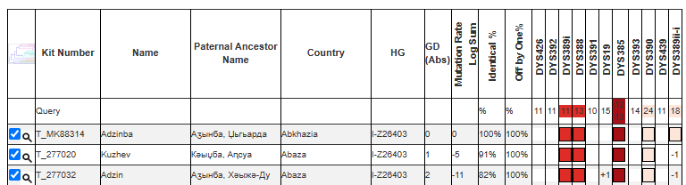 На 12-ти маркерном сравнении Адзинба оказался близок к Адзинову из Старо-Кувинска. К сожалению у Адзинова тест начального уровня и поэтому невозможно с точностью утверждать насколько близко к друг другу окажутся Адзинба и Адзинов.