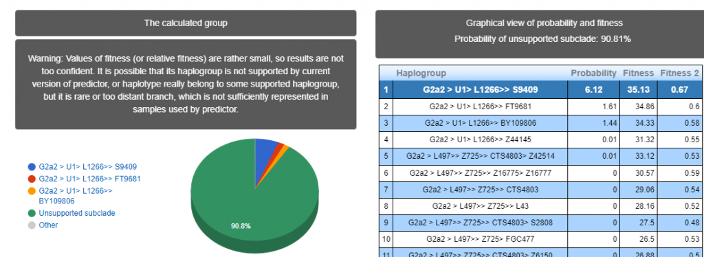 Выявлена гаплогруппа G2a2. Субклад G-L1264 >> S9409 >> BY53833