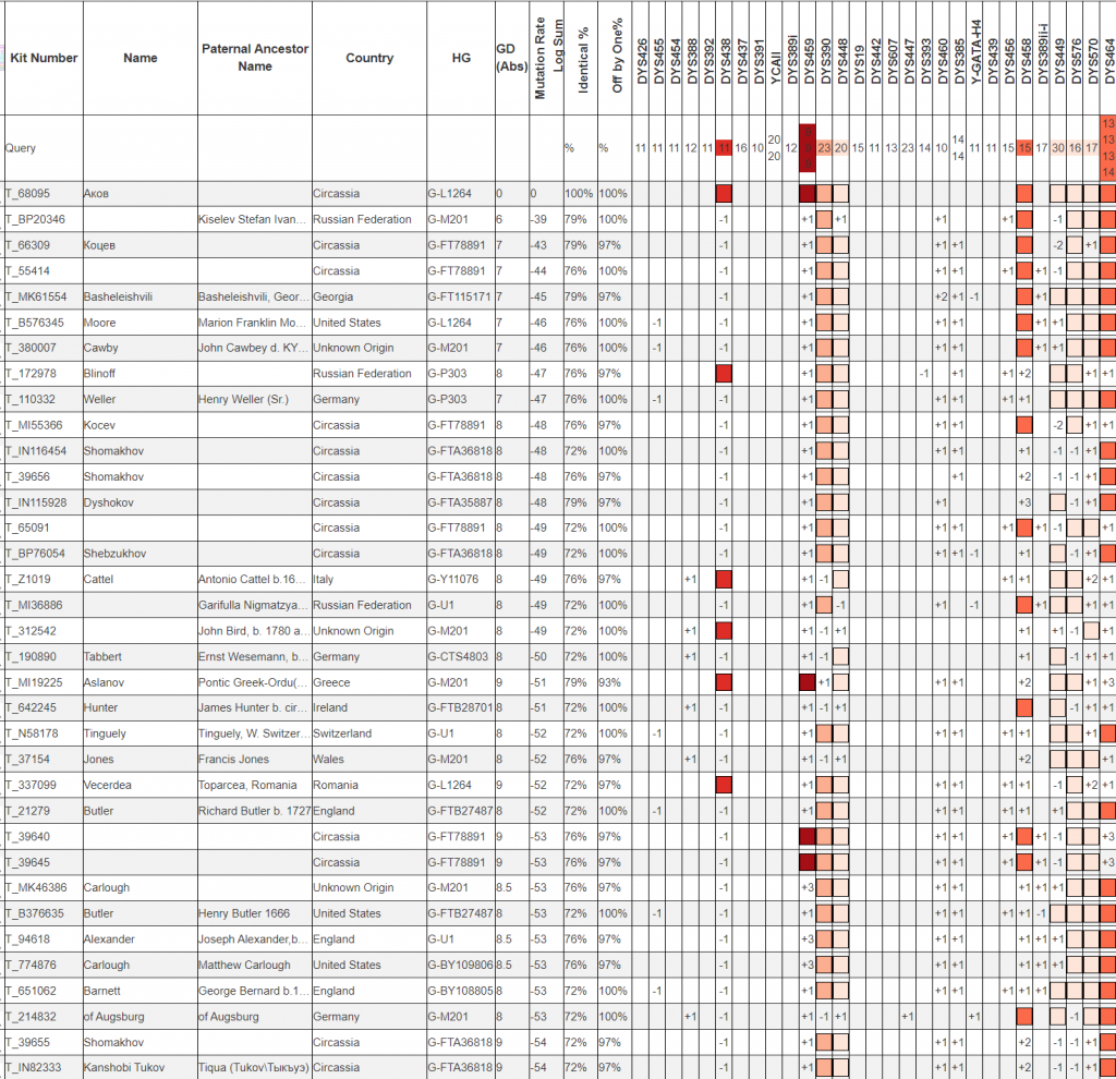 Поиск STR-совпадений в базе STR Match Finder помогает найти потенциальных родственников по мужской линии среди других протестированных из той же популяции. Мерой близости при этом служит генетическая дистанция, зависящая от числа мутационных различий