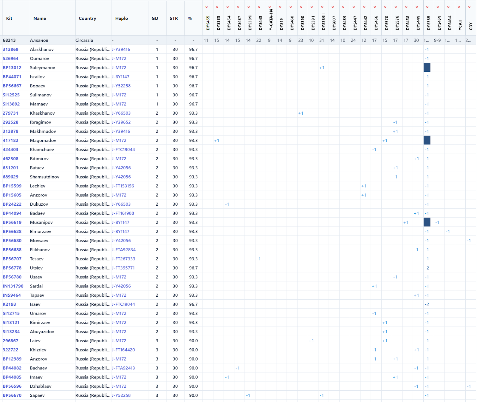 Поиск STR-совпадений в базе STR Match Finder помогает найти потенциальных родственников по мужской линии среди других протестированных из той же популяции. Мерой близости при этом служит генетическая дистанция, зависящая от числа мутационных различий