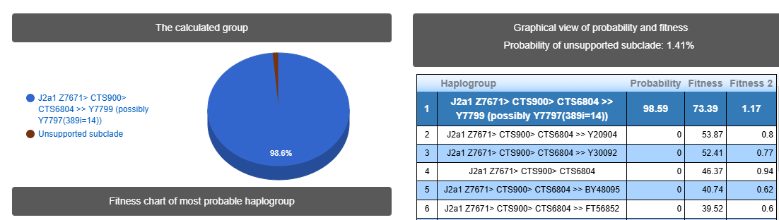 Выявлена гаплогруппа J2a. Наиболее глубокий вероятный субклад >> M67 >> Y3620 >> Y42056