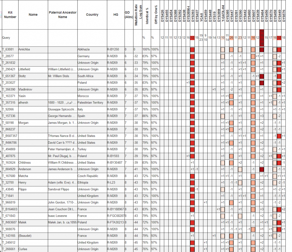 Поиск STR-совпадений в базе STR Match Finder помогает найти потенциальных родственников по мужской линии среди других протестированных из той же популяции. Мерой близости при этом служит генетическая дистанция, зависящая от числа мутационных различий