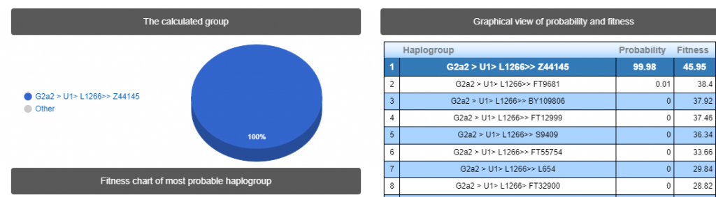 Выявлена гаплогруппа G2a2. Субклад G-L1264 >> Z44150