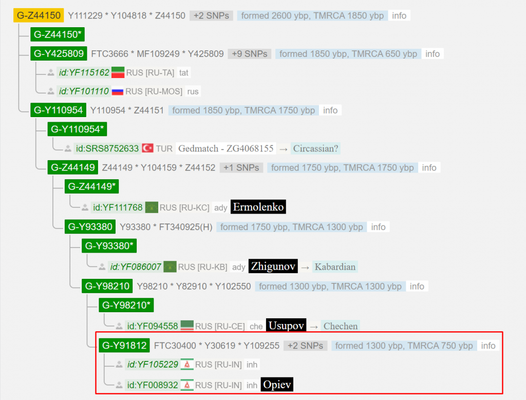 По результатам теста выявлена самая распространенная у адыгов линия G2a2 L1264. За тысячи лет потомки прародителя этого субклада разделились на множество ветвей. Истоки всех эти субкладов идут к древним земледельцам появившимся на Кавказе 7-10 тыс. лет назад.
