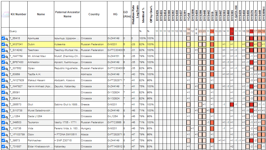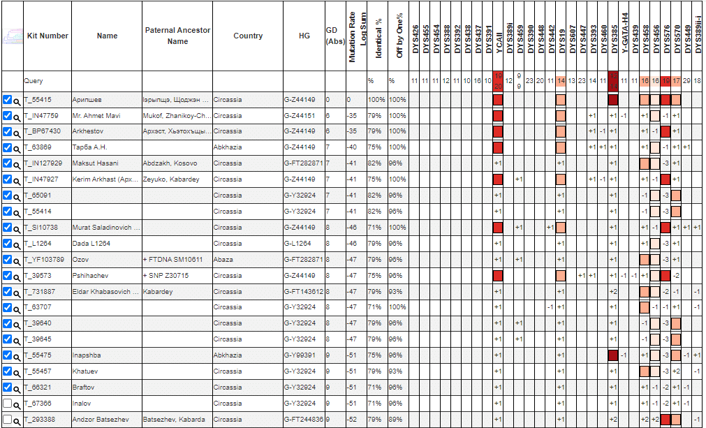 Совпаденцы по маркерам (Y37) в адыго-абхазском ДНК-проекте (август 2024):