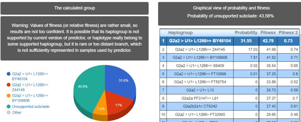 Выявлена гаплогруппа G2a2. Субклад L1264 >> Z44149