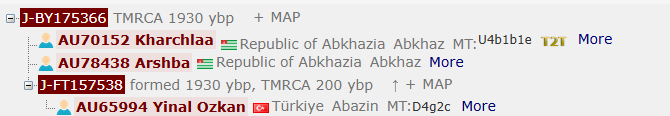 На китайском древе theytree значительно меньше результатов. Согласно данному древу общий предок Аршба, Харчлаа и Кмузова жил 1930 лет тому назад.