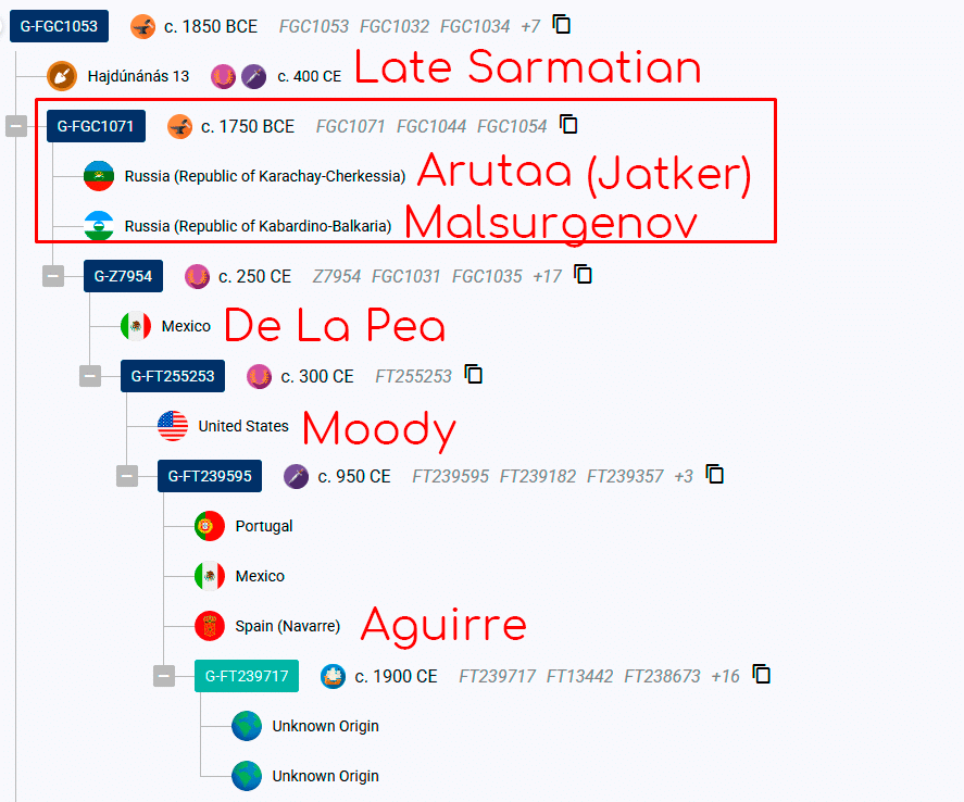 According to the FTDNA tree the common ancestor of Arutaa and ancient Sarmatian lived in 1850 BCE, and the common ancestor with Malsurgenov and a number of Europeans lived in 1750 BCE. Arutaa and Malsurgenov have the general SNP FTC9412 which yet is not displayed on a tree yet. After updating of a tree date of life of the common ancestor of Arutaa and Malsurgenov will be considerably reduced.