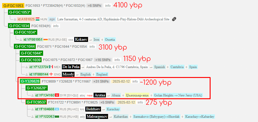 On the Yfull tree, in addition to Malsurgenov’s result, the result of Karachay Bidzhiev was also published. Due to this the branch of Arutaa divided. The estimated time of life of the common ancestor of Arutaa with Bidzhiev and Malsurgenov is 1200 years ago. The exact number will be known after the Yfull tree is updated.