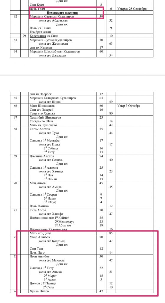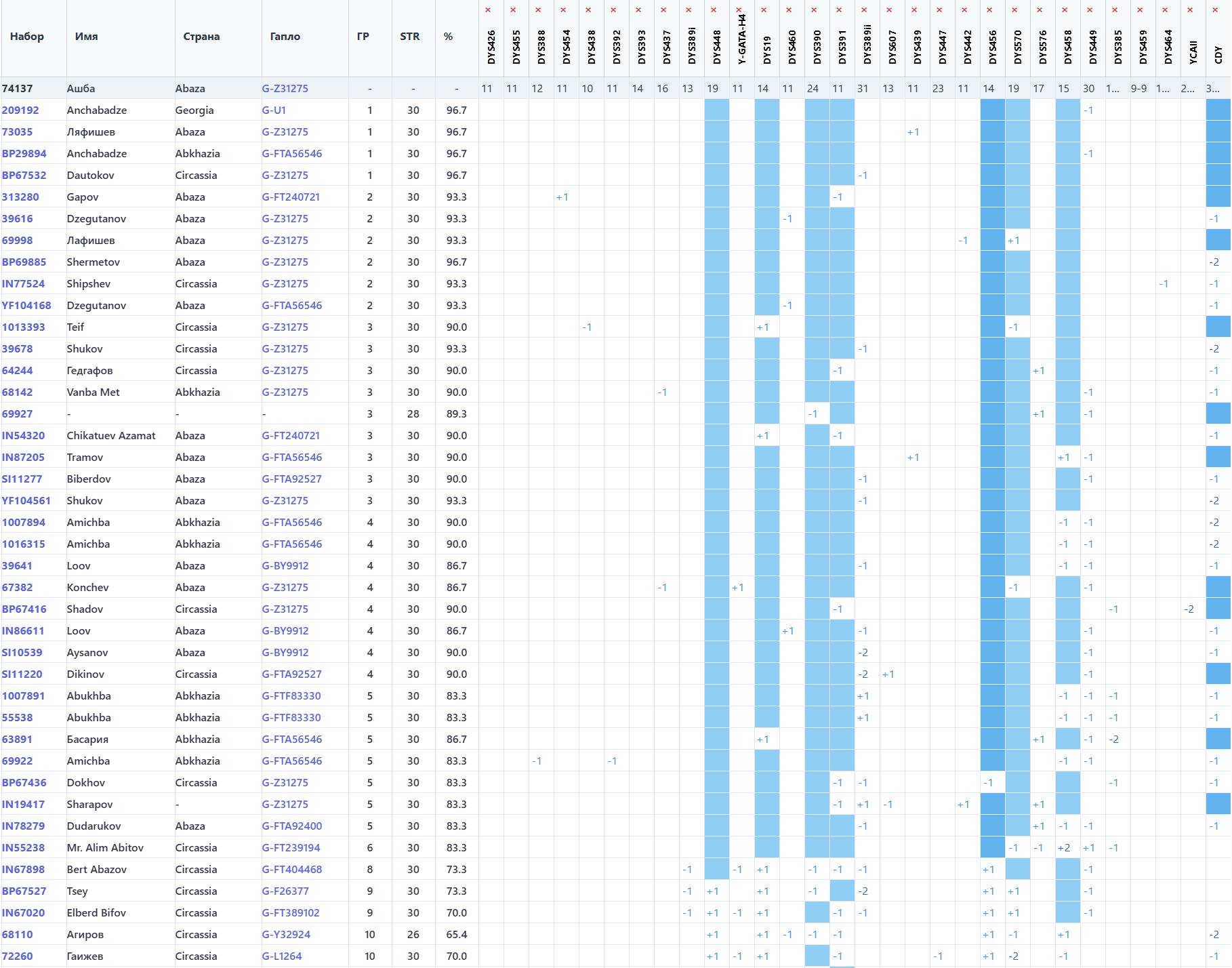 Род протестированных является выходцами из Псху, что подтверждается документально. По результатам теста не совпали с ранее протестированными Ашба из Старокувинска, что и ожидалось, так как последние являются чегереевцами и общего корня с псхувскими не имели.