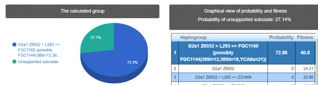 Выявлена гаплогруппа g2a1 >> FGC1159 . Наиболее вероятный FGC1114.