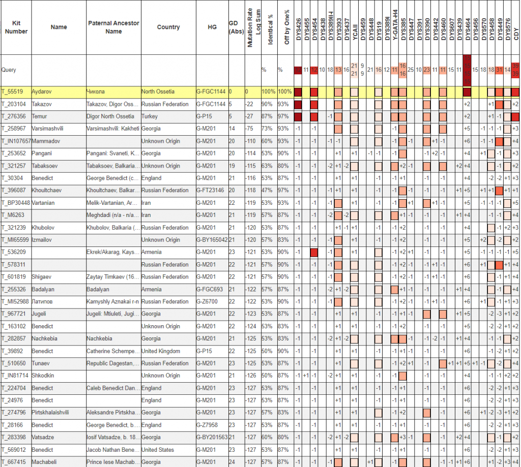 Очевидно, что Айдаров совпадает с другими дигорцами. У Таказова BigY тест. Почти наверняка они с Айдаровым будут объединены в отдельной ветке, при углублении теста последним.