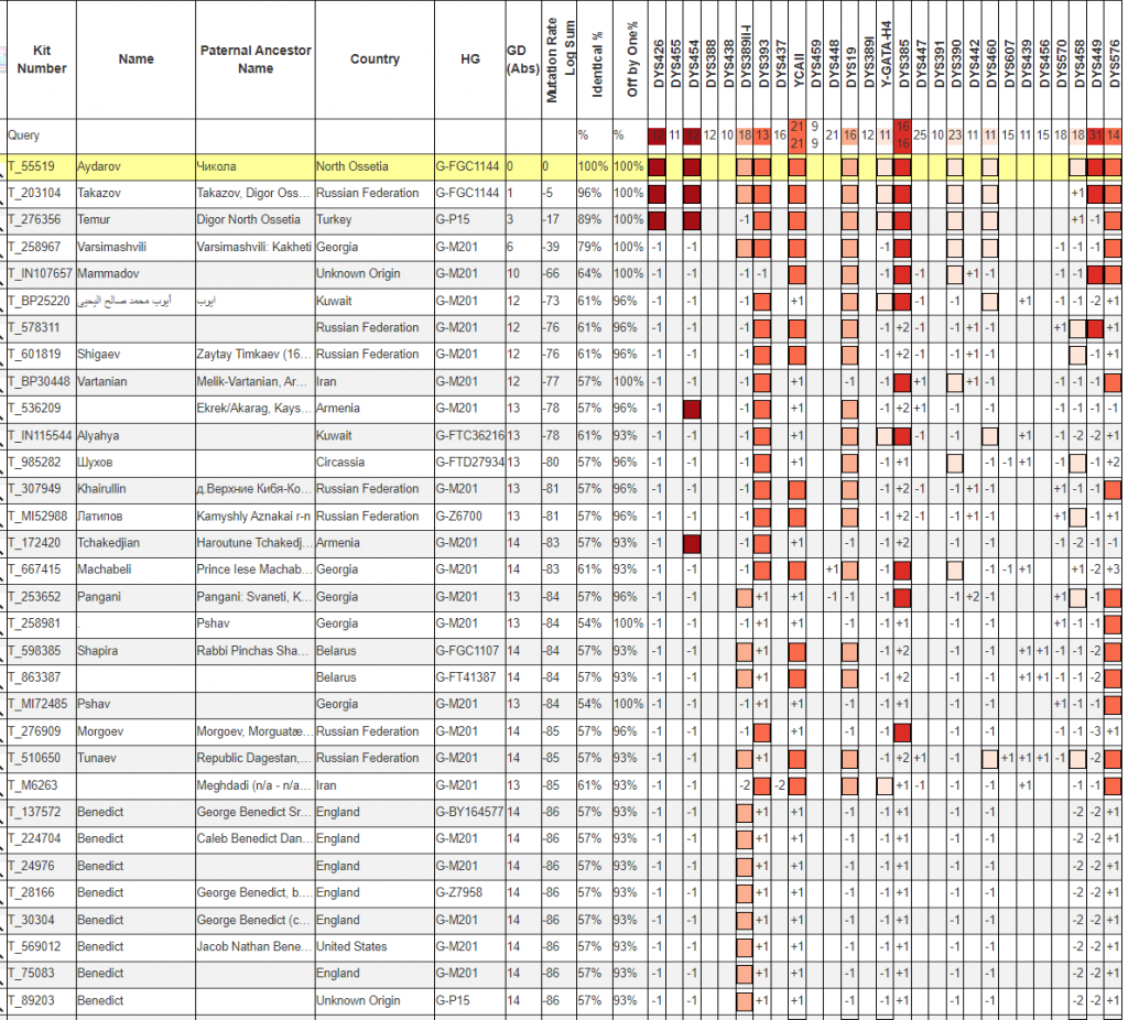 По картинке видно, что основной вклад в цифры по генетической дистанции составляют, как это часто бывает, полиндромные маркеры DYS464 и CDY. Посмотрим список совпадений без них.
