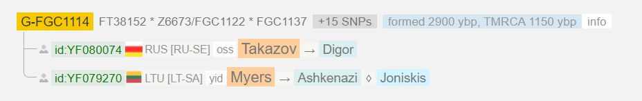 В FGC1114 попадают дигорец Таказов и ашкенази из Литвы Майерс. Что интересно, дистанции между ними всего ~ 1150 лет. Вероятнее всего, Айдаров будет Таказову еще ближе, скорее всего +- до 500 лет.