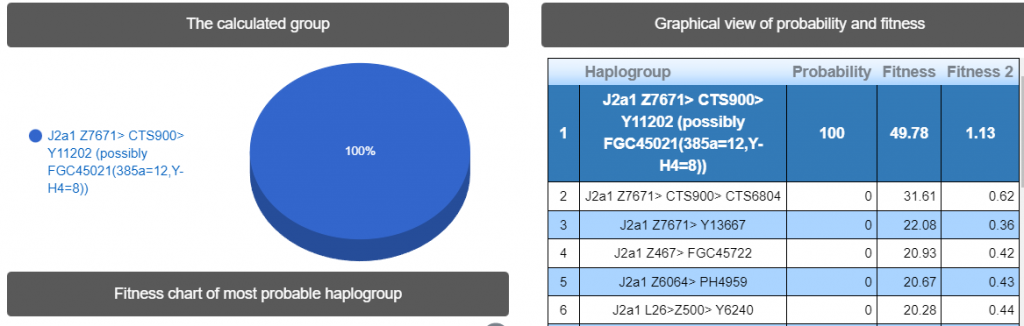 Выявлена гаплогруппа J2a. Наиболее вероятный субклад M67 >> Y11200 >> Y30811.