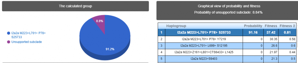 Выявлена гаплогруппа I2a2, субклад L701 > P78 > S25733 > PH2670.