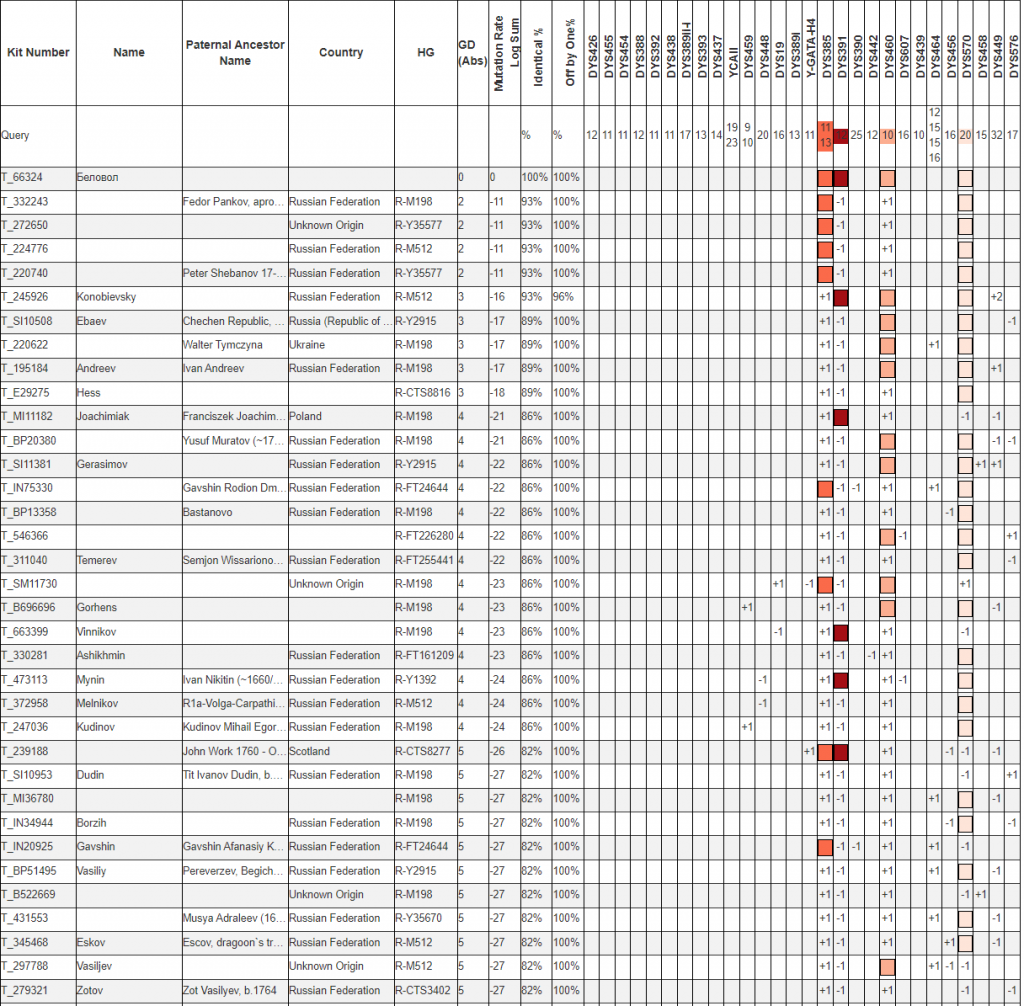 Поиск STR-совпадений в базе STR Match Finder помогает найти потенциальных родственников по мужской линии среди других протестированных из той же популяции. Мерой близости при этом служит генетическая дистанция, зависящая от числа мутационных различий