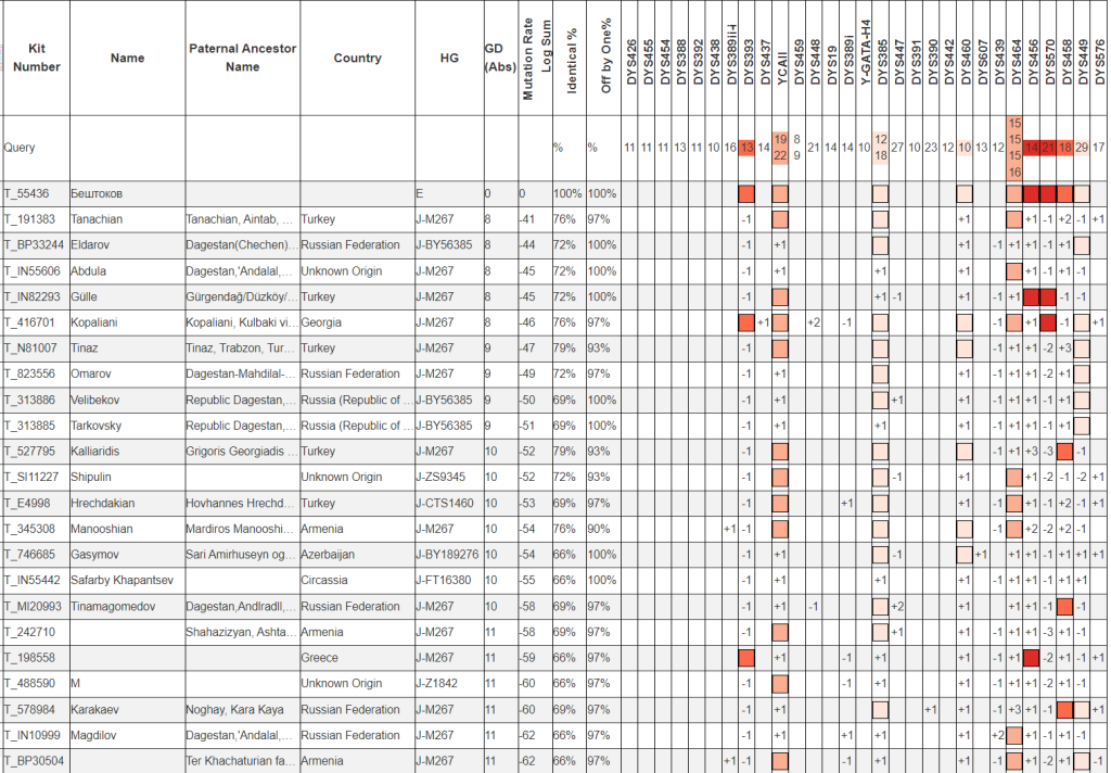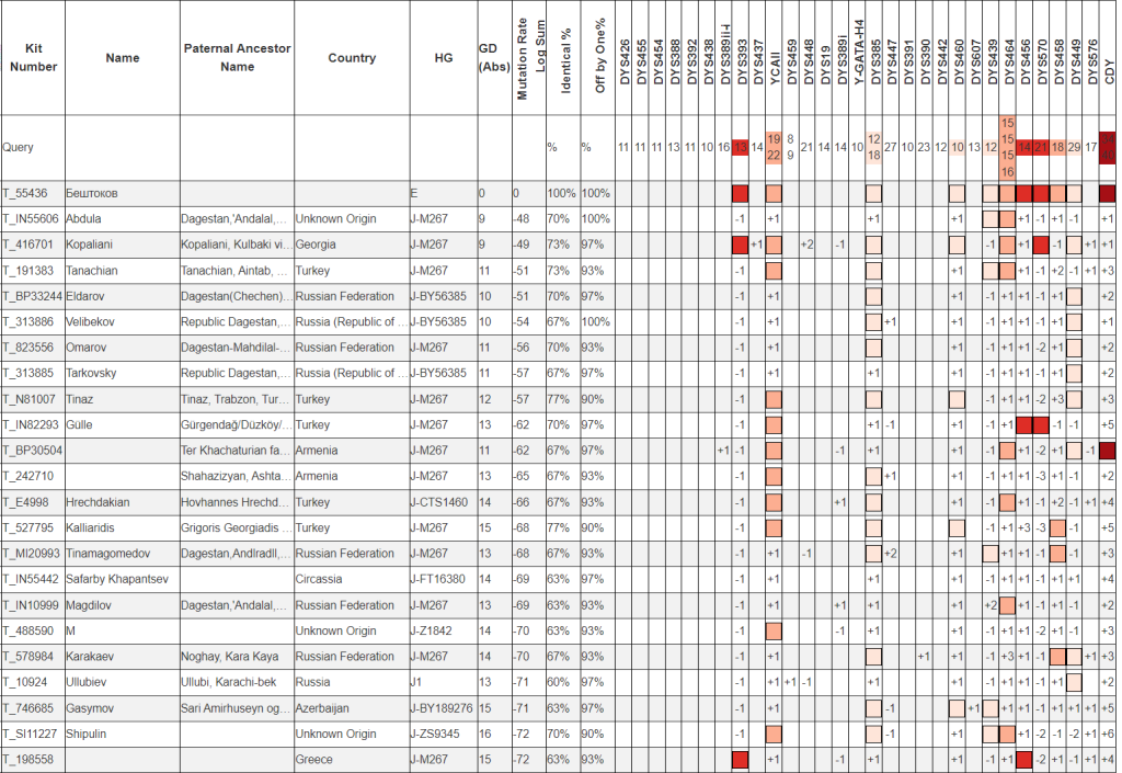 Близких совпадений по отцовской линии не выявлено. Предполагаемая у Бештокова линия в основном характера для Восточного Кавказа.