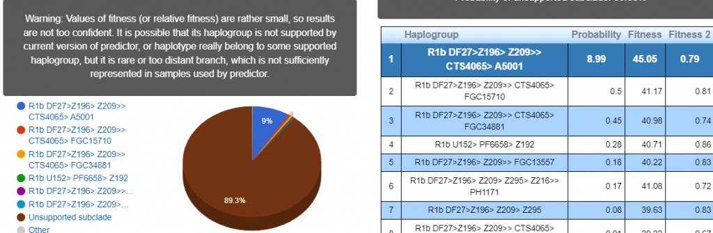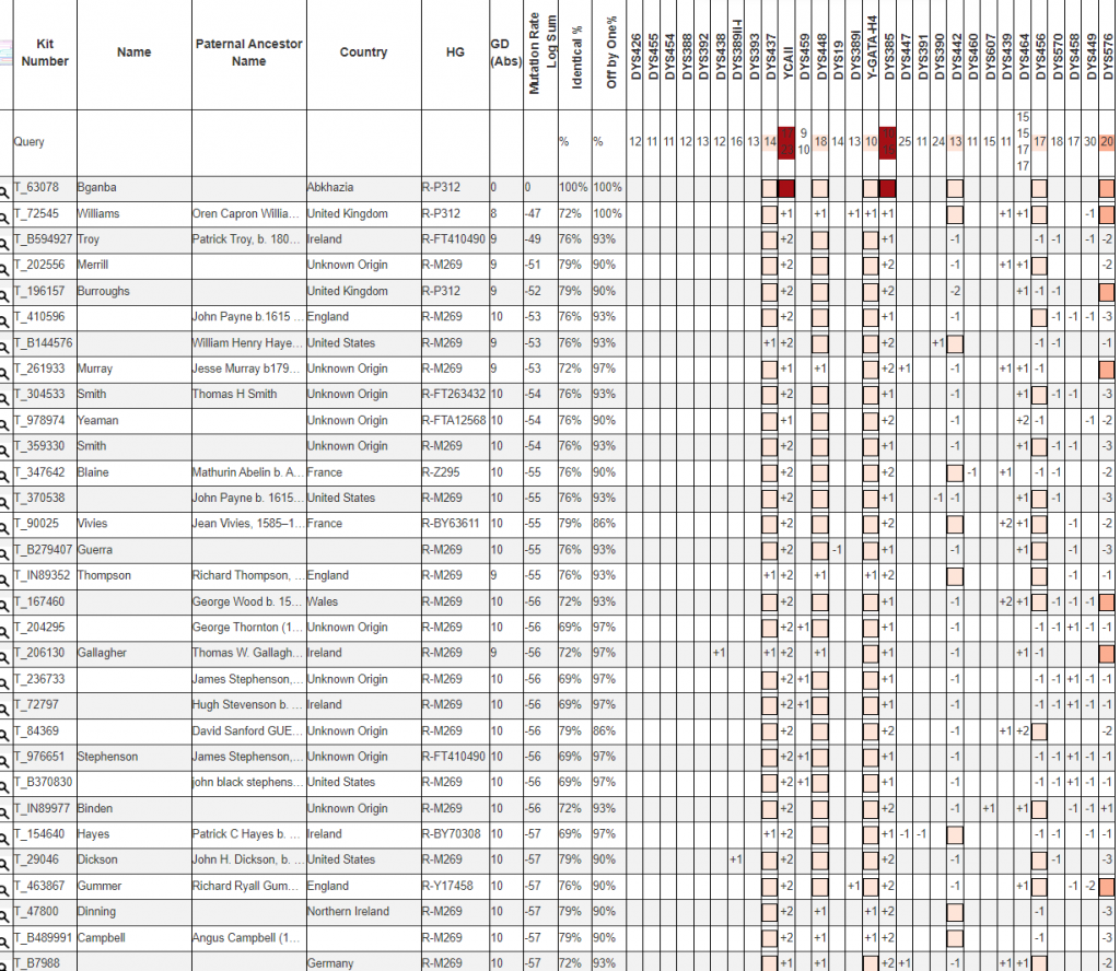Если ориентироваться по генетической дистанции, то ничего полезного из списка совпадений понять нельзя. Все на довольно большом, для R1b, расстоянии. Но если обратить внимание на два красных квадрата — DYS385 и YCAII, то можно углубить предсказание. Из 150 тыс. r1b с такими же редкими мутациями всего 19 результатов. Почти все они относятся к DF83.