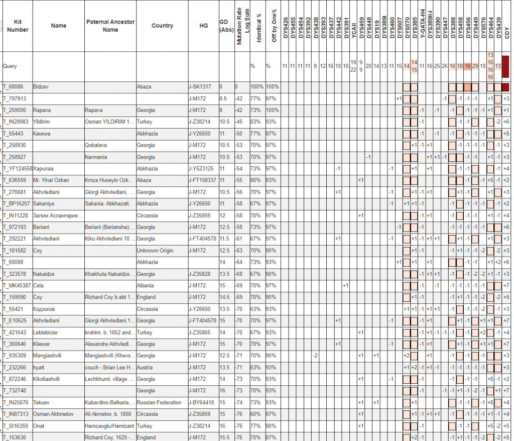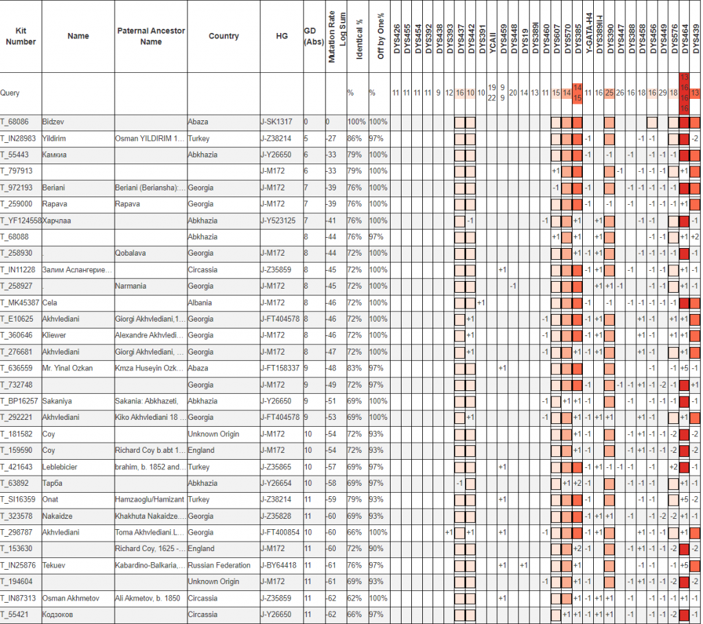 Протестированный принадлежит к тапантинской дворянской (агӏмыста / аамсҭа) фамилии из аула Инжич-Чукун. Родословная сдавшего: Закяхадж > Якуб > Рауф > Аркадий > …