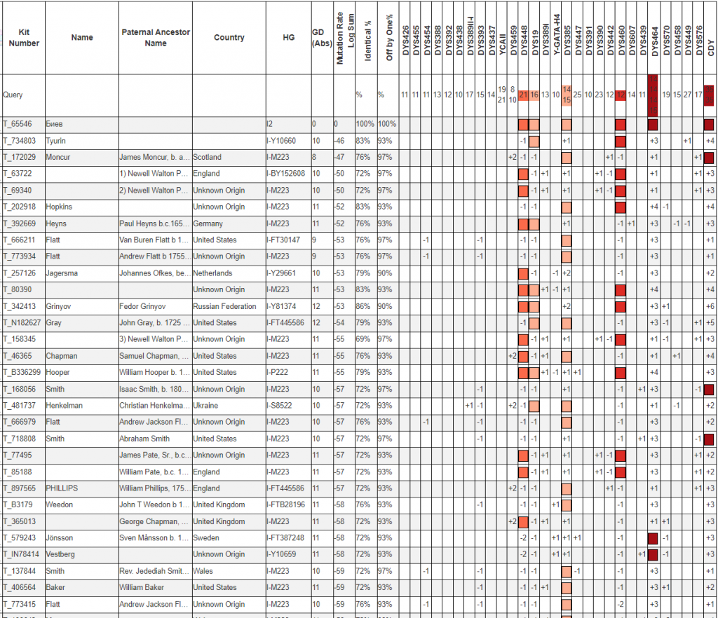 Поиск STR-совпадений в базе STR Match Finder помогает найти потенциальных родственников по мужской линии среди других протестированных из той же популяции. Мерой близости при этом служит генетическая дистанция, зависящая от числа мутационных различий