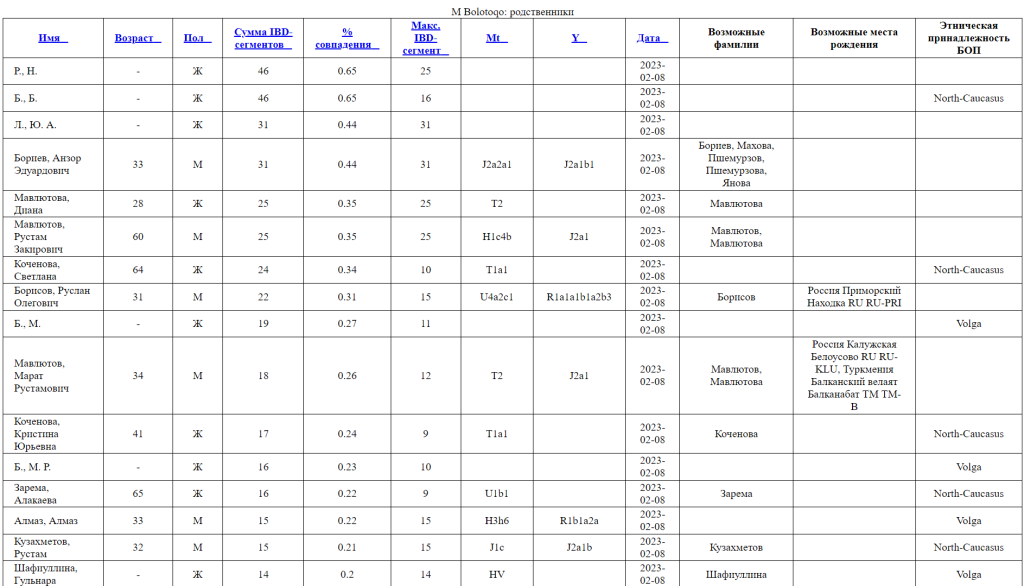 Расчетное время жизни общего предка Болотокова и Гугучия около 3700 лет назад. Также очень интересны итоговые результаты теста Тохтамышева.