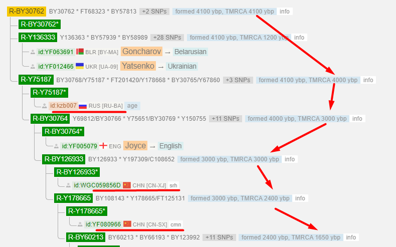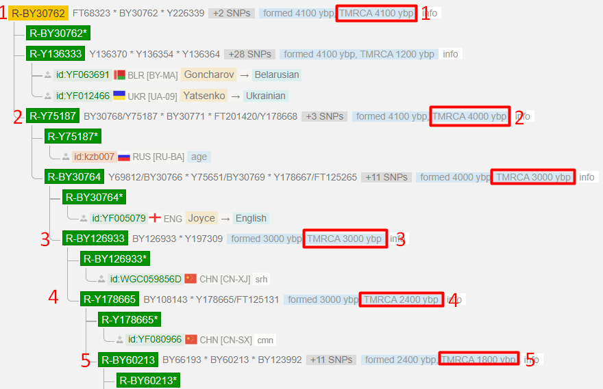 Путь от BY30762 до BY60213 занимает 2300 лет. Все Кавказские результаты попадают именно в пучок с возрастом жизни общего предка в 1800 лет.