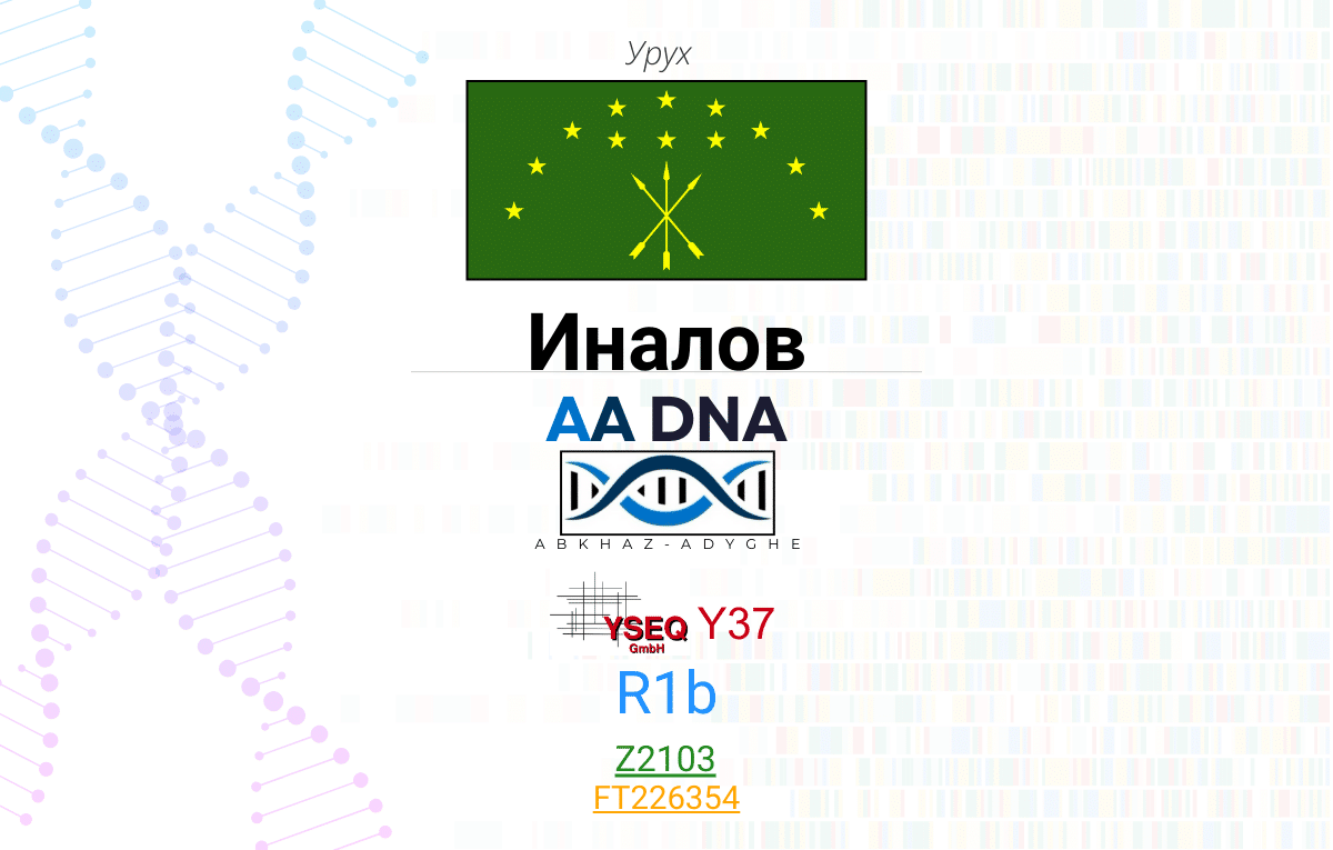 Фамилия: ИналовСубэтнос: кабардинецНаселенный пункт: УрухГаплогруппа: R1b >> Z2103 >> Z2106 >> FT226354 Иналов попадает в ветвь в основном представленную осетинами. Результат не совпал с Иналовым из Егерухая. Исследовано 37 маркеров в лаборатории YSEQ. Выявлена гаплогруппа R1b. Предполагаемый субклад Z2103 >> Z2106 >> FT226354 Полная линия:Adam > A0-T > A1 > A1b > BT > CT > … Читать далее