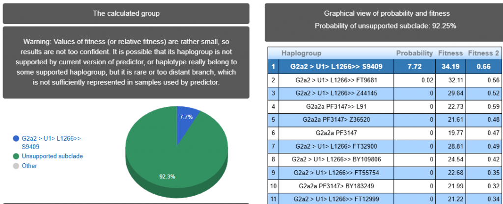 Выявлена гаплогруппа G2a2 G-L1264. Наиболее вероятный субклад S9409 >> Y184961.