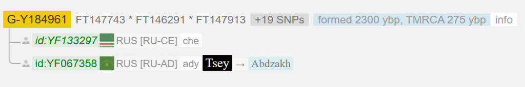 При отсутствии глубокого теста, мы оперируем вероятностными оценками. Основания для таких оценок это предсказания (оценка) калькуляторов и оценка списка совпадений. В данном случае мы можем с очень высокой степенью вероятности констатировать совпадение результатов 3х Цей (Цеевых). У одного из Цей глубокий тест. Что интересно с ним довольно близком совпал чеченец по фамилии Абазуев. Дистанция до общего предка ~ 275 лет.