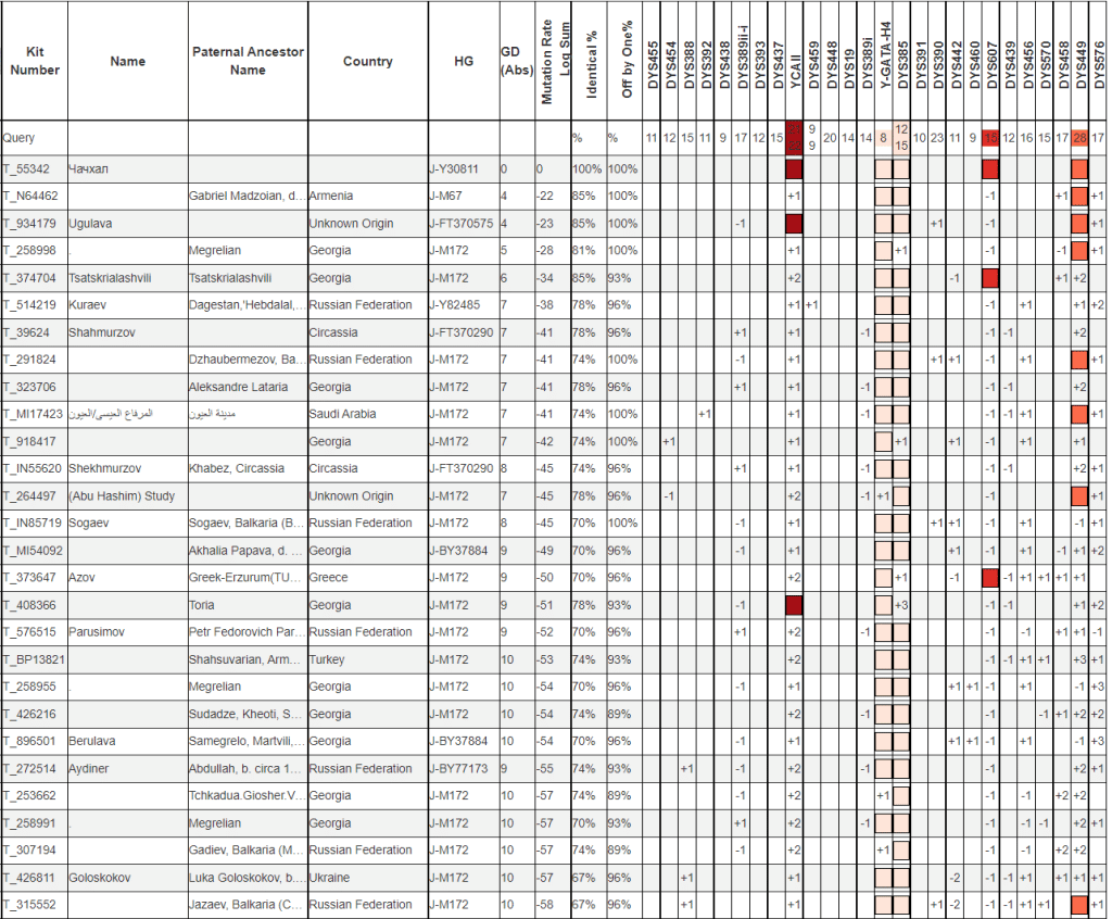 Результаты теста выявили попадание в Кавказскую линию гаплогруппы J2a. Эта линия не самая массовая, но присутствует в генофонде многих народов Кавказа, в том числе у адыго-абхазов. Близких совпадений на дистанции менее 1000 лет не выявлено. Дальнейшие тесты позволят найти более близких совпаденцев.