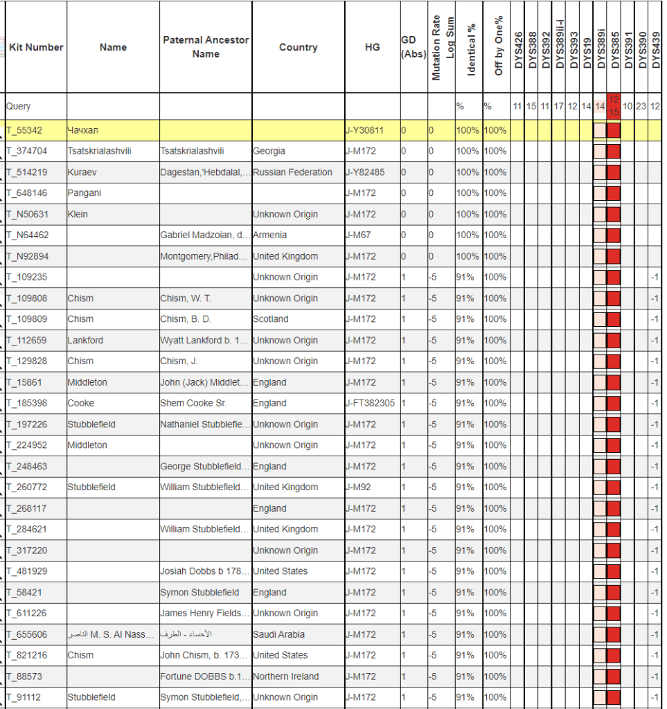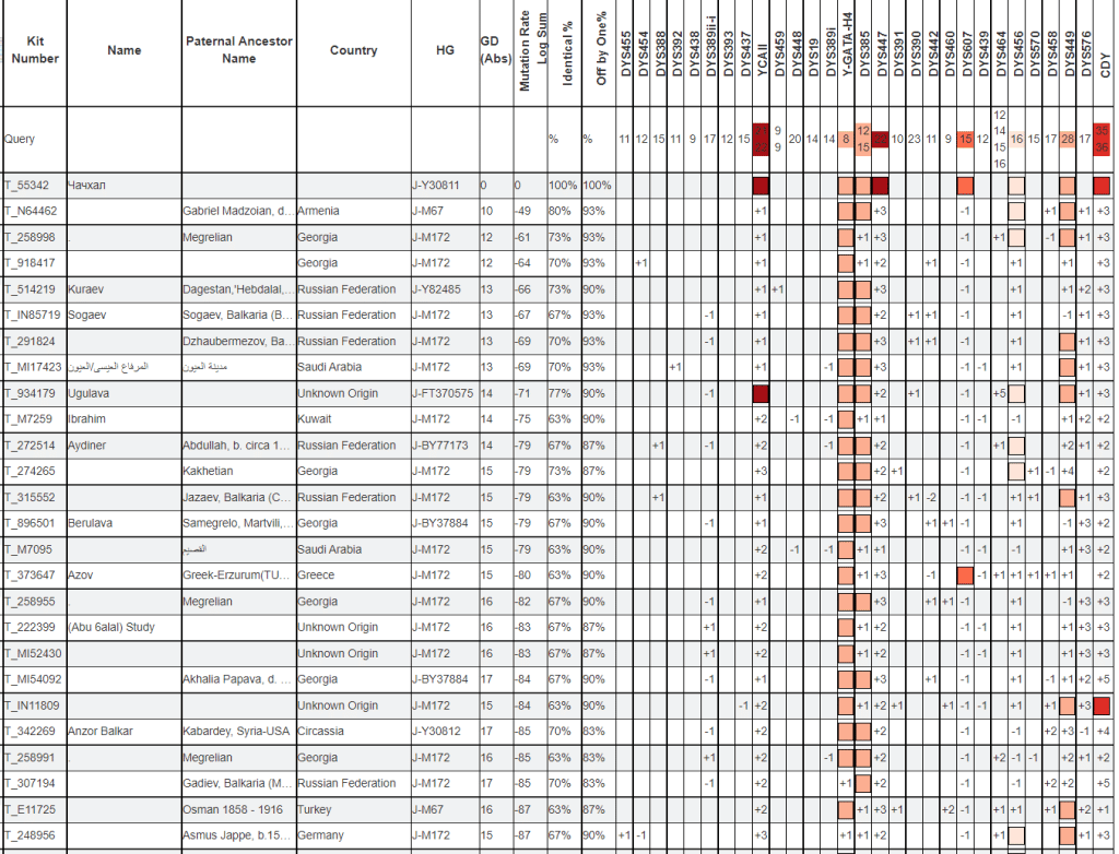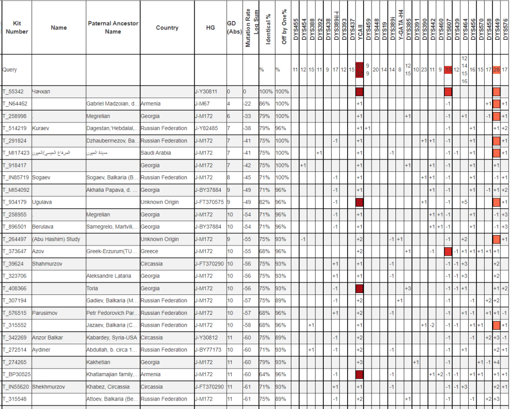 С одной стороны мы смотрим на цифру по генетической дистанции (GD). Здесь ближе всего результат из Армении. С другой стороны обращаем внимание на редкие мутации, выделенные темно красным цветом. И еще нам важно зацепиться за тех у кого есть глубокий тест, чтобы можно было прикинуть вероятную ветку на древе Yfull. Таким образом самый интересный для нас мегрел Угулава. Самый большой вклад в их различие по генетической дистанции внес маркер DYS464. Это полиндромный маркер (состоит из нескольких цифр). Посмотрим на список без него.