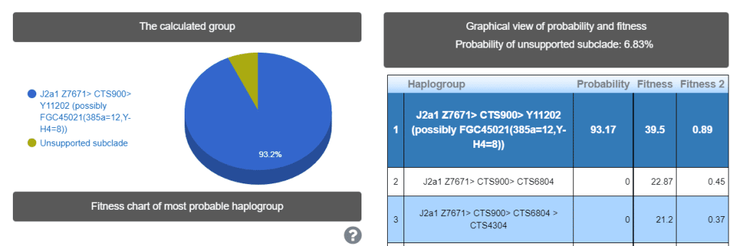 Выявлена гаплогруппа J2a. Наиболее вероятный субклад M67 >> Y11200 >> FT370290.