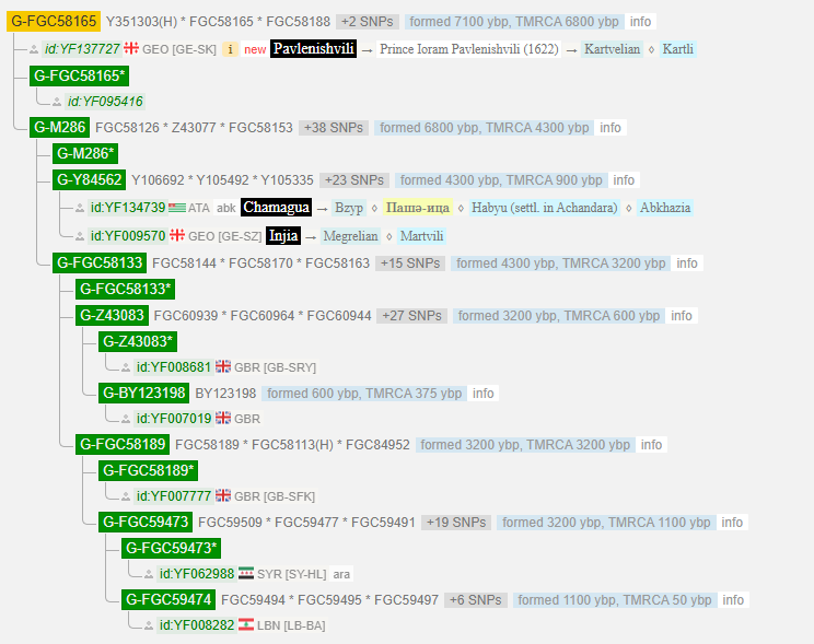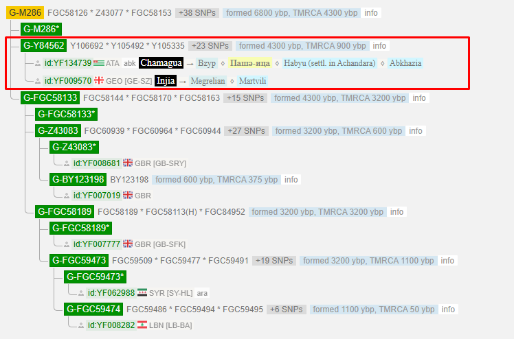 Чамагуа образовал новую ветвь Y84562 вместе с мегрелом Инджия. Общий предок их двоих жил 900 лет тому назад.