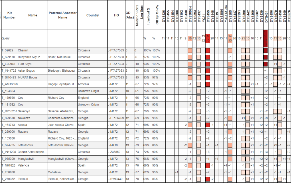 В результате теста выявлены довольно близкие совпадения с западно-адыгскими фамилиями Сохт, Богус, Мэлыщ. Дистанцию до их общих предков определить сложно, но скорее всего она будет меньше 1000 лет.