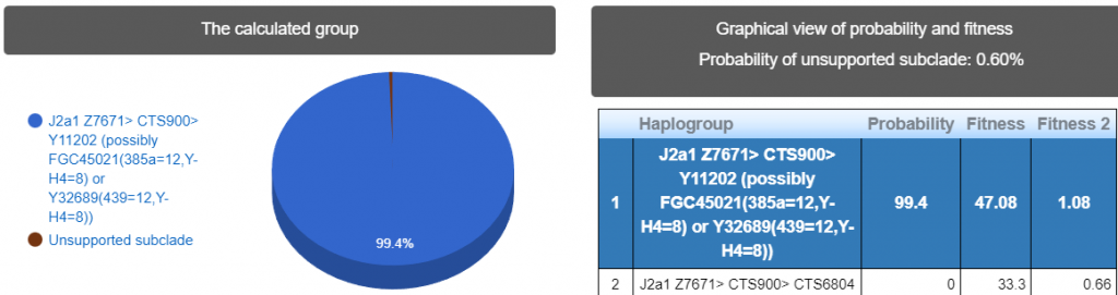 Выявлена гаплогруппа J2a. Наиболее вероятный субклад M67 >> Y11200 >> Y30811.