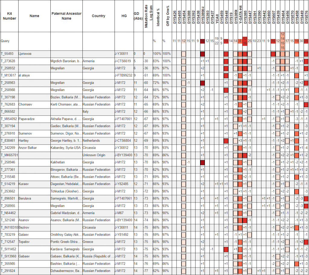 Ципинов из с. Ходзь не совпал с Ципиновым из с. Камлюко, который получил гаплогруппу G2a1 FGC719, и с одним из Ципиновых с. Малка, который получил редкую гаплогруппу I1.