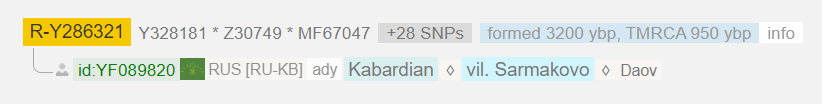 Резюмируя можно с высокой степенью вероятности предсказать попадания в ту же ветку что и Даов и 2х остальных представителей нашего проекта. Так же можно предположить Абазинское происхождение и Даова.