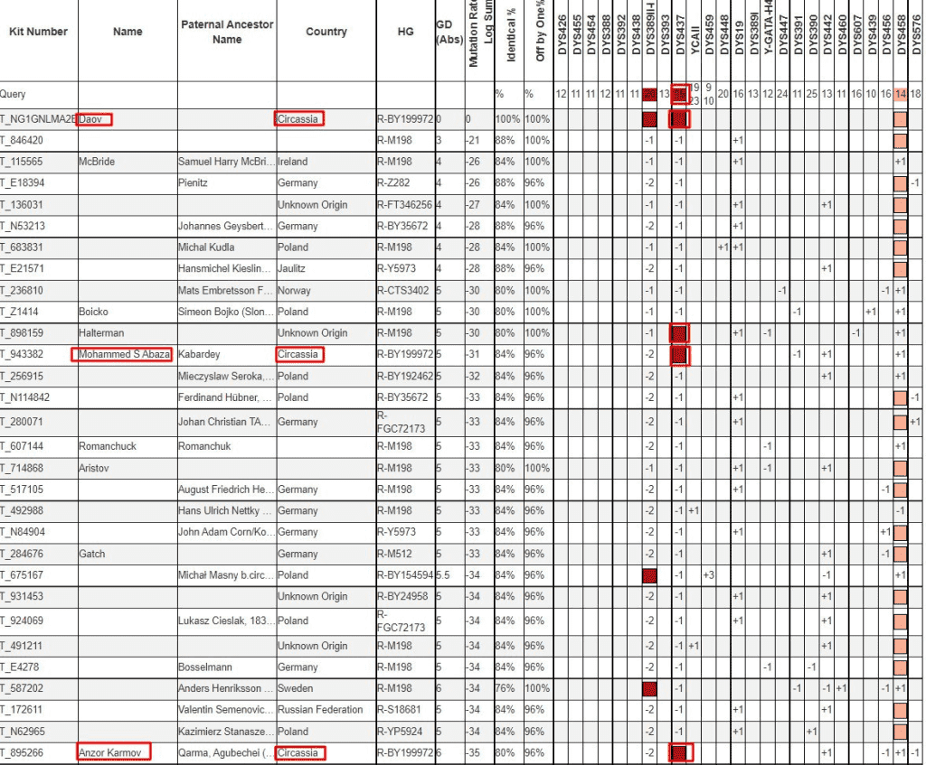 Сразу бросается в глаза редкая мутация в маркере DYS437. Такая же мутация есть у Кармова и Кабардинца Абазинского происхождения. Данный прогноз подтверждается и предсказаниями Nevgen.