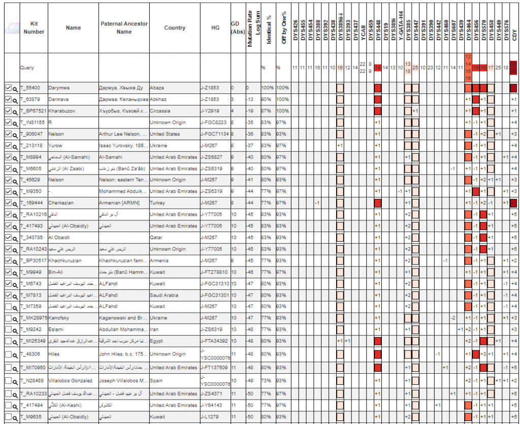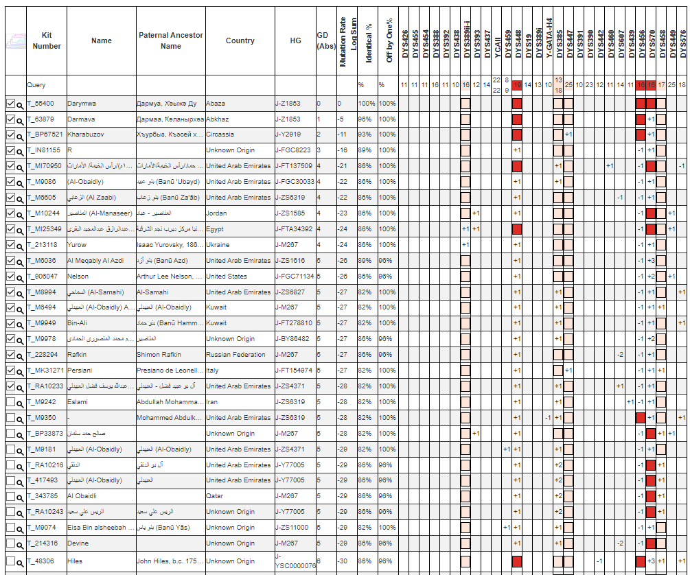 Поиск STR-совпадений в базе STR Match Finder помогает найти потенциальных родственников по мужской линии среди других протестированных из той же популяции. Мерой близости при этом служит генетическая дистанция, зависящая от числа мутационных различий