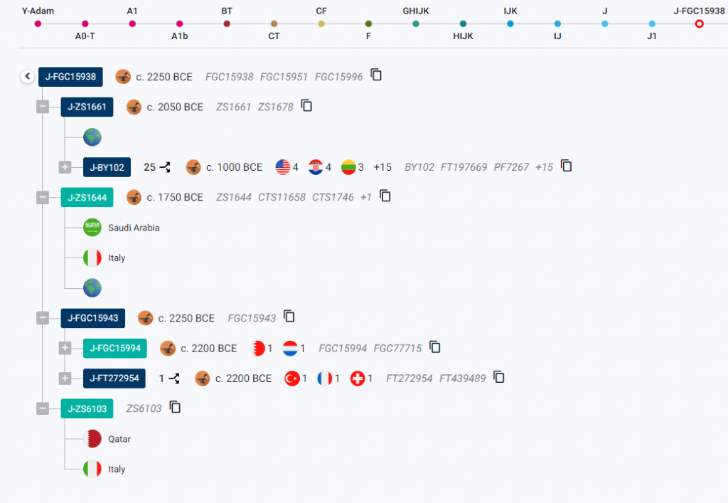 Adam > A0-T > A1 > A1b > BT > CT > CF > F > GHIJK > HIJK > IJK > IJ > J > J1 > Z2215 > Z2217 > L620 > PF4816 > L136 > P58 > CTS9721 > Z643 > Z1865 > Z1853 > Z2331 > Z2324 > Z2317 > Z2313 > YSC0000234 > Z1884 > Y2919 > Y6094 > Y6096