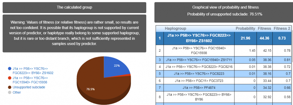 Выявлена гаплогруппа J1. Наиболее вероятный субклад J-P58 >> Y2919 >> Y6096