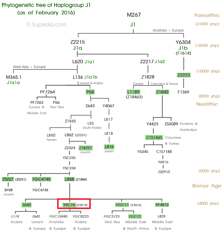 По ссылке подробная информация по гаплогруппе J1 в целом. История, разные линии, филогенетическое древо.