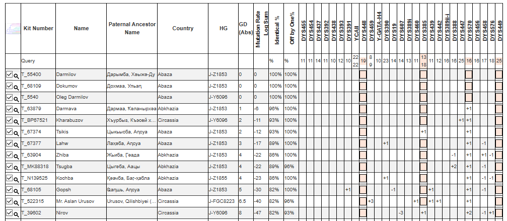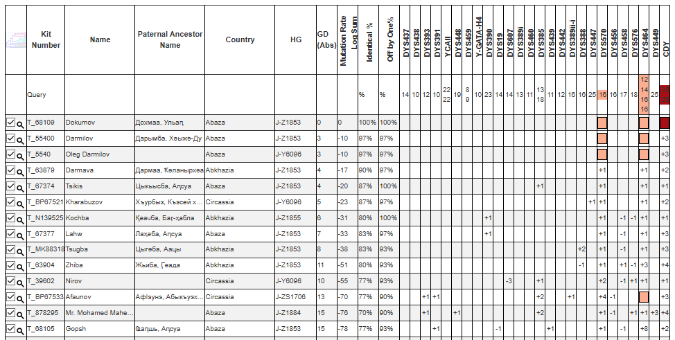 По результатам теста Докумов попал в абхазо-адыгский пучок внутри Y6096, где помимо него находятся абхазо-абазины (Цикисов, Квачба, Дармаа-Дармилов, Озов, Лахов, Цугба, Гопшев, Жиба) и черкесы (Ниров, Афаунов, Харабузов). При этом большая часть фамилий объединена общим происхождением из общества чегерей (чагьараи).