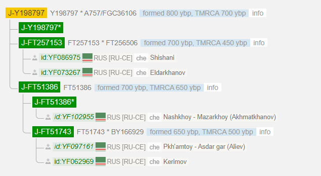 Клады гаплогрупп обозначаются латинскими буквами. Самые распространенные на Кавказе клады гаплогрупп — G, J, R1a. Возраст образование кладов гаплогрупп 20+ тыс. лет. Клады делятся на субклады. Это еще более свежи побеги на стволах общего древа. Есть очень древние субклады и совсем современные. Чем глубже тест, тем больше шансов определить наиболее современные линии и соответственно найти более близких родственников.