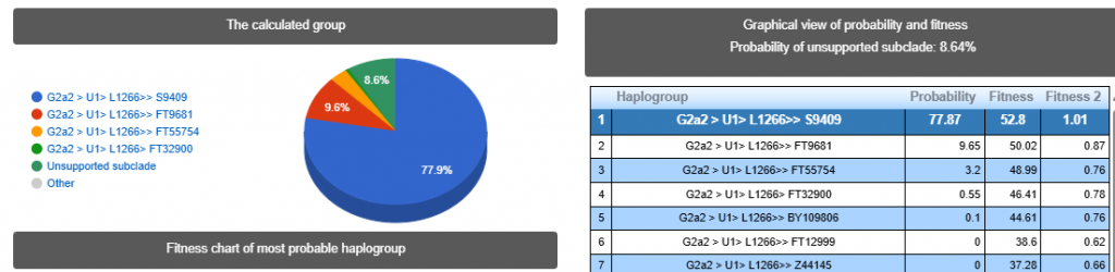 Выявлена гаплогруппа G2a2. Субклад G-L1264 >> S9409