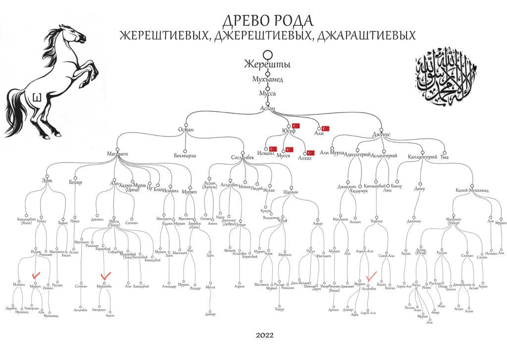 На картинке ниже представлено древо Джерештиевых (Джараштиевых\Жерештиевых). Протестировано 3 представителя рода (отмечены на схеме). ДНК тест подтвердил единое происхождение. Выявленная гаплогруппа g2a1 характерна для центрального Кавказа в целом. Более глубокая ветка Z45053 объединяет представителей разных народов. Родоначальник этой линий жил на рубеже нашей эры (~1850 лет назад).